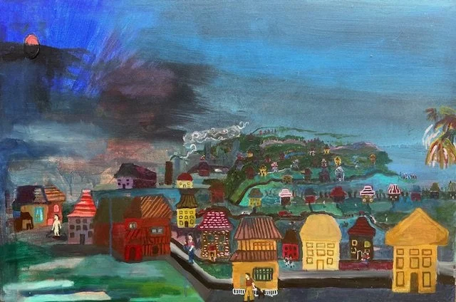 ‘Sunset Fell Over the Town’, was I piece I worked on directly from imagination. The use of only imagination without looking at anything, was inspired from teaching children and seeing their wonderful world of imagination. I found the canvas for the piece on the streets of Brooklyn, with the sky painted on it. I then decided to paint the town on the painting.